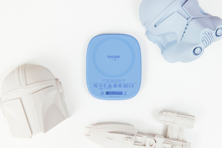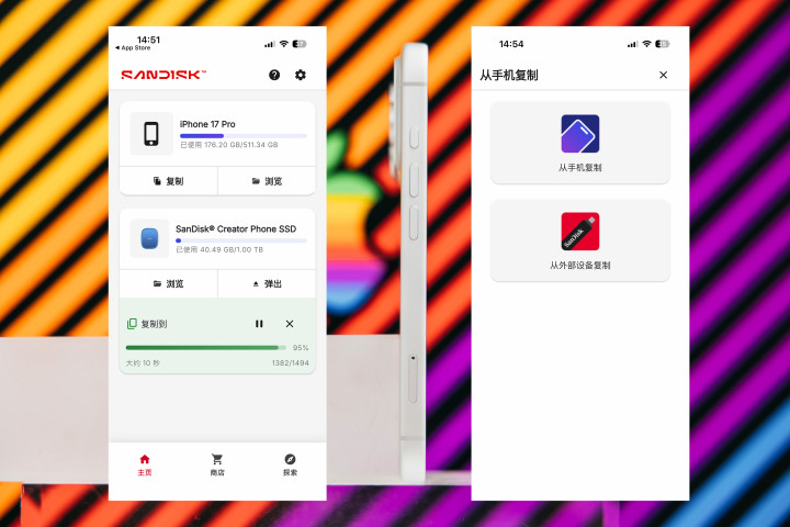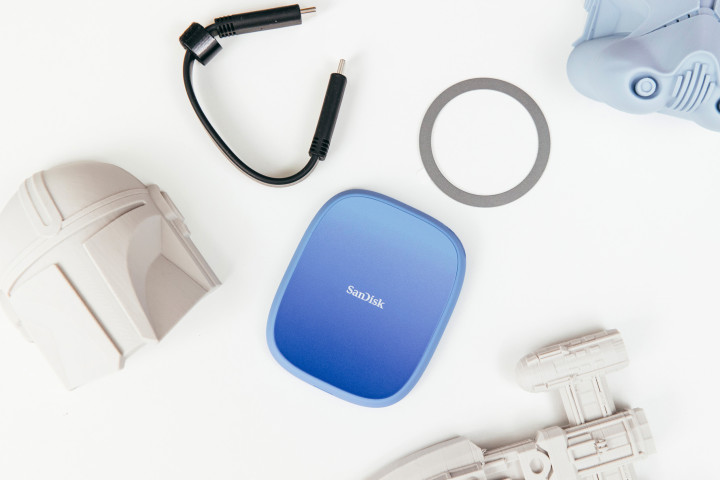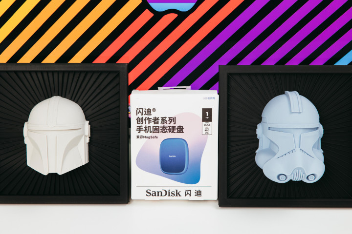 闪迪创作者手机固态硬盘就是为此而生的,配件方面就主体和软数据线以及一个磁吸圆环,也可以在不支持magesafe的手机上使用。