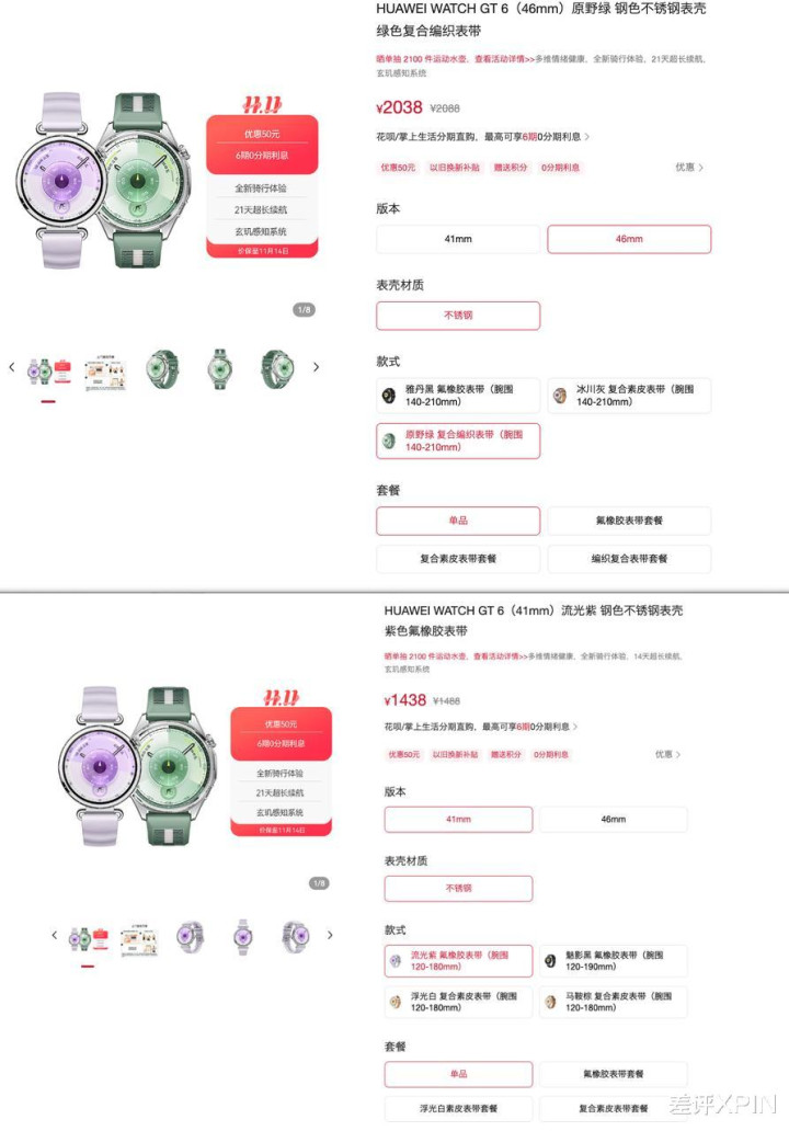 并且别看都叫 WATCH GT 6,但其实 41mm 和 46 mm 的标准版的外观并不是所谓的套娃外观,光靠外表判断的话,除了都是圆形表盘之外,可以说完全是两块表。。。